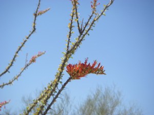 It was a really nice weekend to be out, overall. It’s starting to get warm – mid 90’s yesterday and today. But it’s still cooling down at night and is really nice early in the morning. The heat conditioning is important for the horses, and us, as well. A lot of the desert plants are blooming right now – hedgehog cactus, the last of the ocotillo, greasewood. Those are pretty, but par for the course. What I love about right now is the saguaros and ironwoods are starting to bloom!