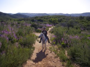 Me and Mimi Sunday morning. This was just after you spent some time weaving through the unburned part of the forest, where some of the grass was as high as my head! Granted, short horse + short rider doesn’t make that quite as impressive, but meh. The trail ended up on the top of a slight plateau, where there were these field of purple flowers carpeting the hills. We went on a fire road for a while, then all the way back down to the bottom of the hill. Gotta test out those cruppers, y’know. ;)