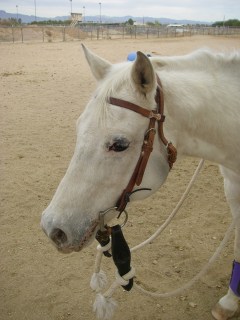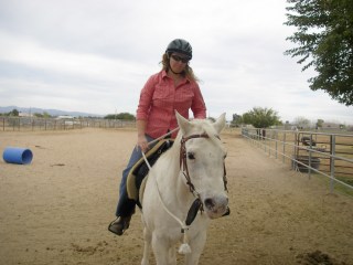 | Cross-dressing for the horse world. Blue jeans, cowboy boots. Helmet, English saddle. |