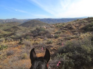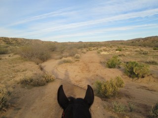 After the climb, we were on a jeep road that slowly started winding back towards camp. With the internal compass pointed due “trailer”, both mares perked up even more…perhaps a bit too much so, as Wicked started trying to canter the small uphills, which in turn meant Liberty also wanted to canter…and exercise her canter-induced “happy feet” (read: crowhops that threatened to turn into some bucks). Uh, not in my world, sweetheart.