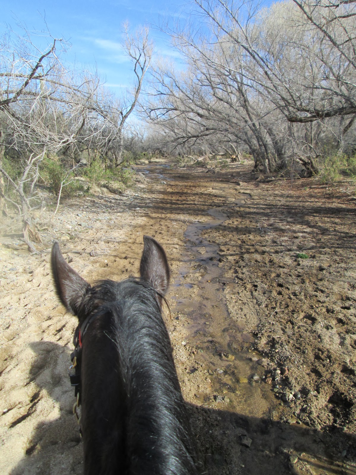 Heading back through the wash and stream was a blast. Liberty was a bit unsure of the water, so as long as Wicked went ahead, we were actually able to trot through the wash, splashing through the water. (Next time, I must remember to get video.)