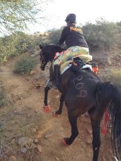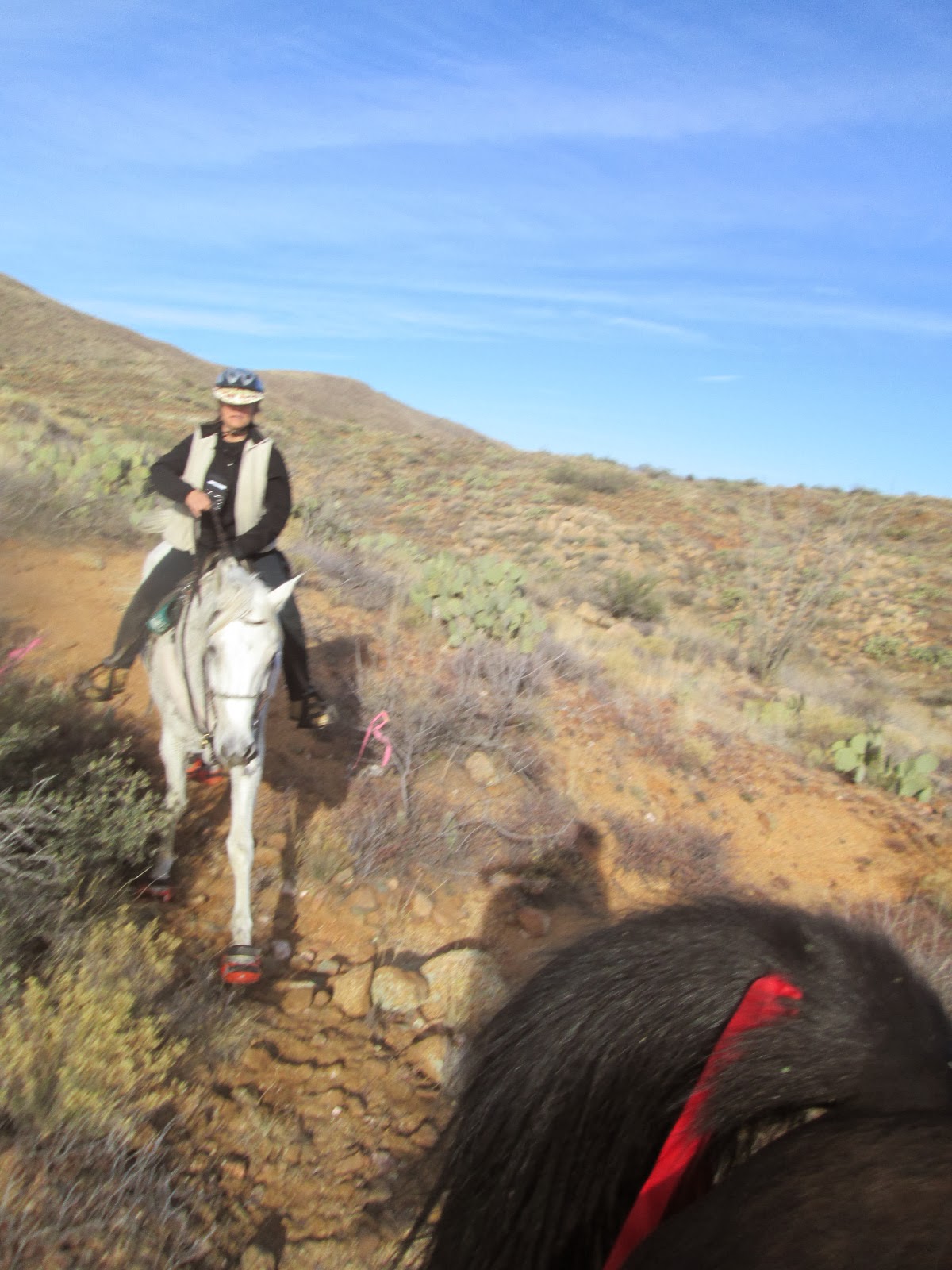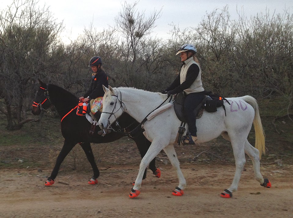 We did quite a bit of frequent trading off and on of who was leading for the first half of the first loop, which was a mix of sand wash and road like the above photo. Liberty also started drinking when we hit the water at 7 miles, and proceeded to drink at every available opportunity afterwards. Hydration will not be a problem with this mare.