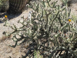 This is just one of many varieties of cholla cactus. “Choy-yuh.” Have most commonly heard “chawl-la” but also it is also frequently associated with the phrase “Ouch, dammit, get it off, it’s stuck to me!”