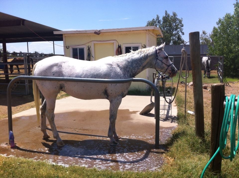And after riding, she got a full bath. Up to this point, she’s just gotten water-only spray-offs, but today was a full soap bath. “Yellowtail” is a type of fish, not a proper pony color designation. Plus her hind legs were all nasty and peed-upon from her aforementioned flirtations. And the flies and mosquitoes are out, so she’s itchy. And it was triple-digit temperatures. All good reasons for a thorough scrub-down.