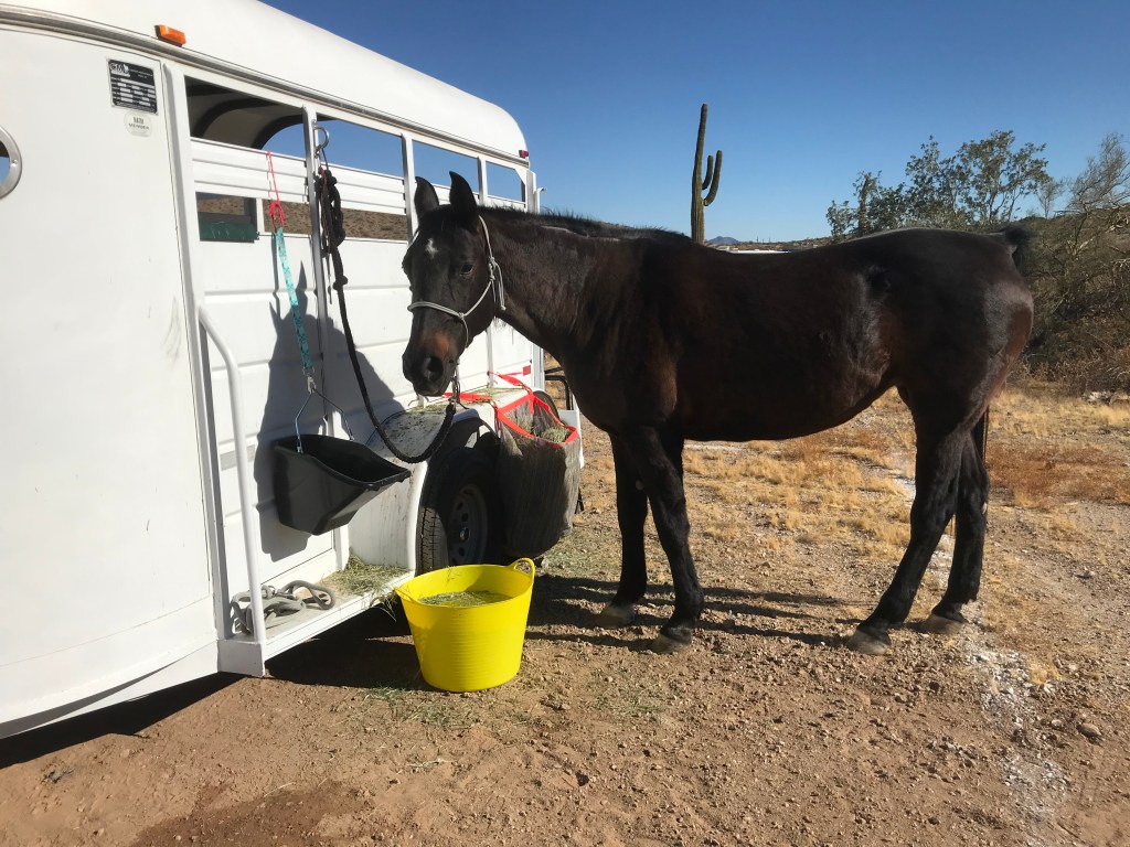 I yanked the offending strap off the rest of the way before heading over to the vet — nothing like loose, flapping pieces of things to make a vet take a second look. She vetted really well — stood politely, looked around for where her new buddies had disappeared to but didn’t holler or get upset, let the vet look at her mouth, and then did a lovely trot-out — and we were pronounced good to go. The hold was 45 minutes, and with vetting right away and not having to wait at all, I now had about 40 minutes of uninterrupted rest time for the mare. I fetched my crew bag, Liberty trailing along behind me, attempting to snatch hay out of the bag on the go, then found a spot to set up. The vet check was in the middle of the main equestrian parking lot at Estrella Mountain Park — a large gravel lot — so it was pretty much a matter of “find your own personal patch of gravel and settle in.”