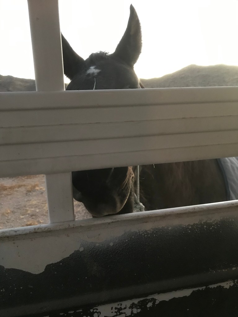 Back at camp, I spent some more time visiting and catching up with friends I hadn’t seen for quite a while, then got Liberty tucked in for the night and fed. The inside of the trailer was set up as my nifty little feed and storage room — tack in one area, horse feed on one wall, human food & “kitchen” set-up on the other. It worked quite well and was a very efficient and convenient little set-up to work out of. Liberty quickly learned from whence food was dispensed, and proceeded to watch me through the trailer slats every time I went in there, in the hopes of procuring more goodies for herself.