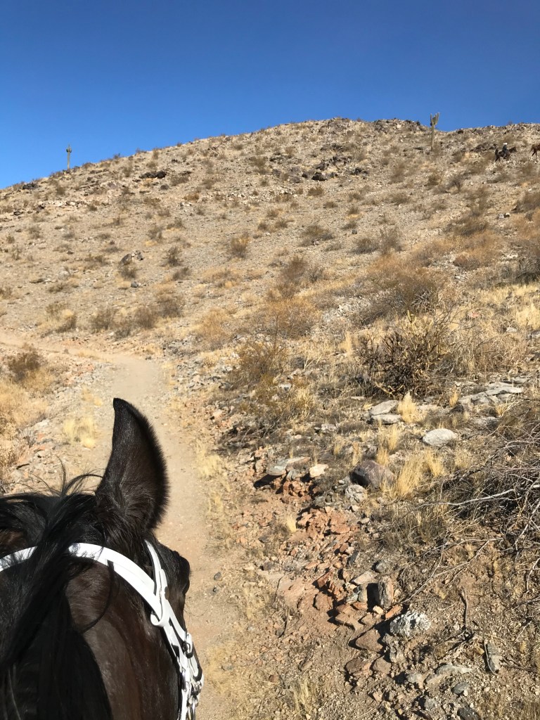 Now seemed as good of a time as any to see what I had to work with, given that she was mentally engaged and very relaxed and settled. I settled myself in the saddle, shoved away the mental uncertainties that always try to pop up whenever I go to pick up the speed, kissed and cued, and after a couple of faster trot strides, she rolled right over into a beautiful canter. She is, hands down, the easiest horse I have ever cantered. She is smooth, and although she’s strong, she collects up beautifully, where I can actually sit down in the saddle, ride with contact, put leg on her, and drive her forward and up into the bridle. Most horses, I have a hard time riding a relaxed canter. They’re either rough enough that it’s not very comfortable, or fast enough that it’s just easier to two-point. Gets you somewhere quickly, but not particularly relaxing, and I always feel way more vulnerable at a canter to either shenanigans or not being able to stay with a sudden shy at speed. In this case, the fact I was able to sit and keep such a strong leg on her meant I felt super secure and stable, even moreso than when she moves into a faster trot. She is also the kind of horse who locks onto the trail and gets even more focused the faster you go, so things that she had been peeking at when we were trotting along (barrel cactus, dead ocotillo, large rocks) didn’t even warrant a side glance at the canter.