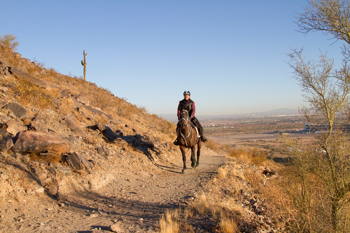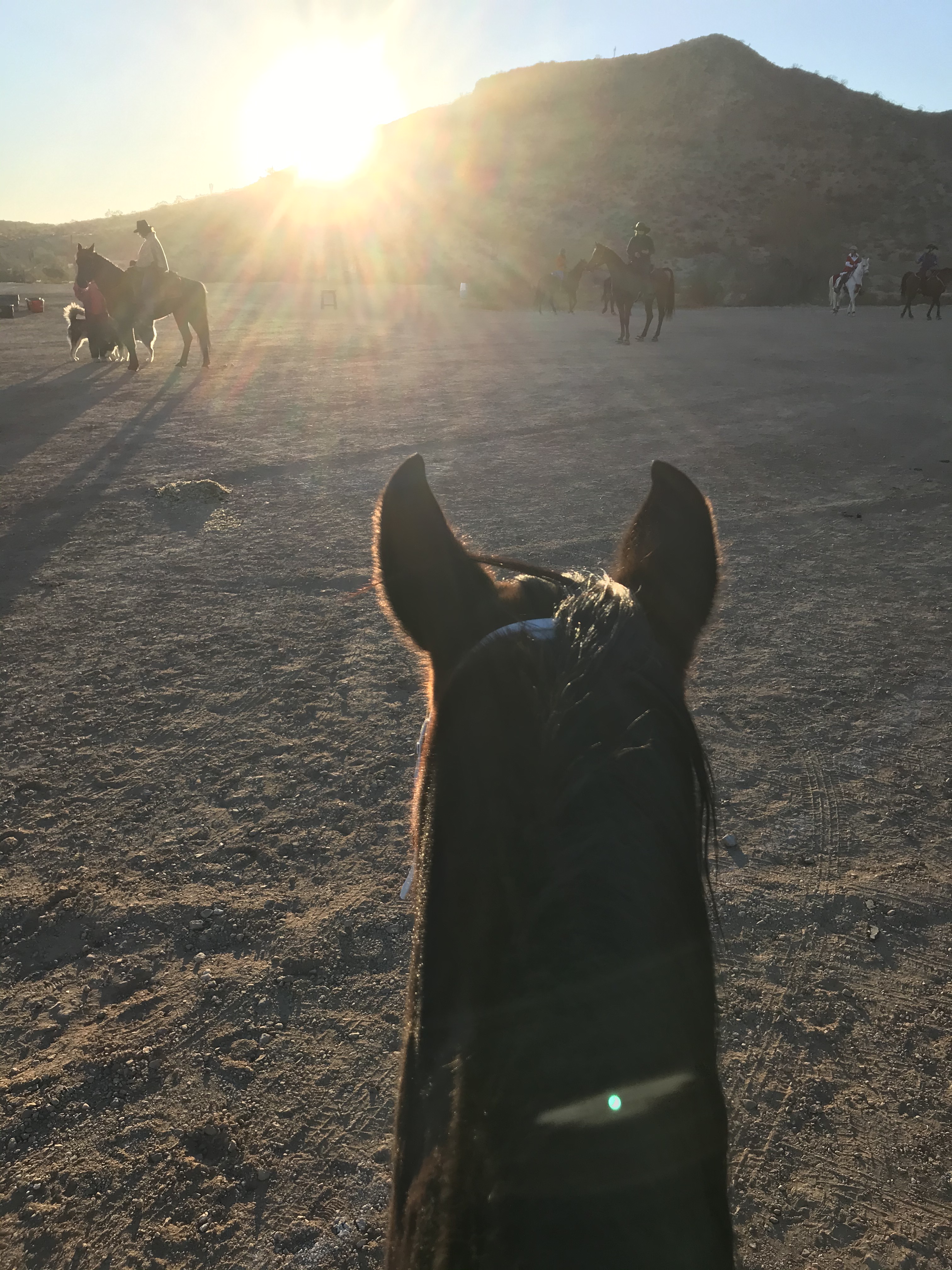 I debated on pre-riding that afternoon but ultimately decided it would probably be a good idea to saddle up (she was already booted anyway) and go out for a stretch and make sure all of our tack was in order and that the marbles were still firmly tucked inside her skull…especially since she hadn’t been ridden for about a week and half. She was a little bit squirmy for mounting, but once I was aboard she was pretty settled, only tossing in a few prancey-jiggy steps as we headed out of camp, but once on the trail she got right down to business. We warmed up for a few minutes, then I let her start slow trotting where it was appropriate, slowly bleeding off some of her energy, but mostly we walked, enjoying each other’s company and the peace and quiet of the Sonoran Desert in the late afternoon.