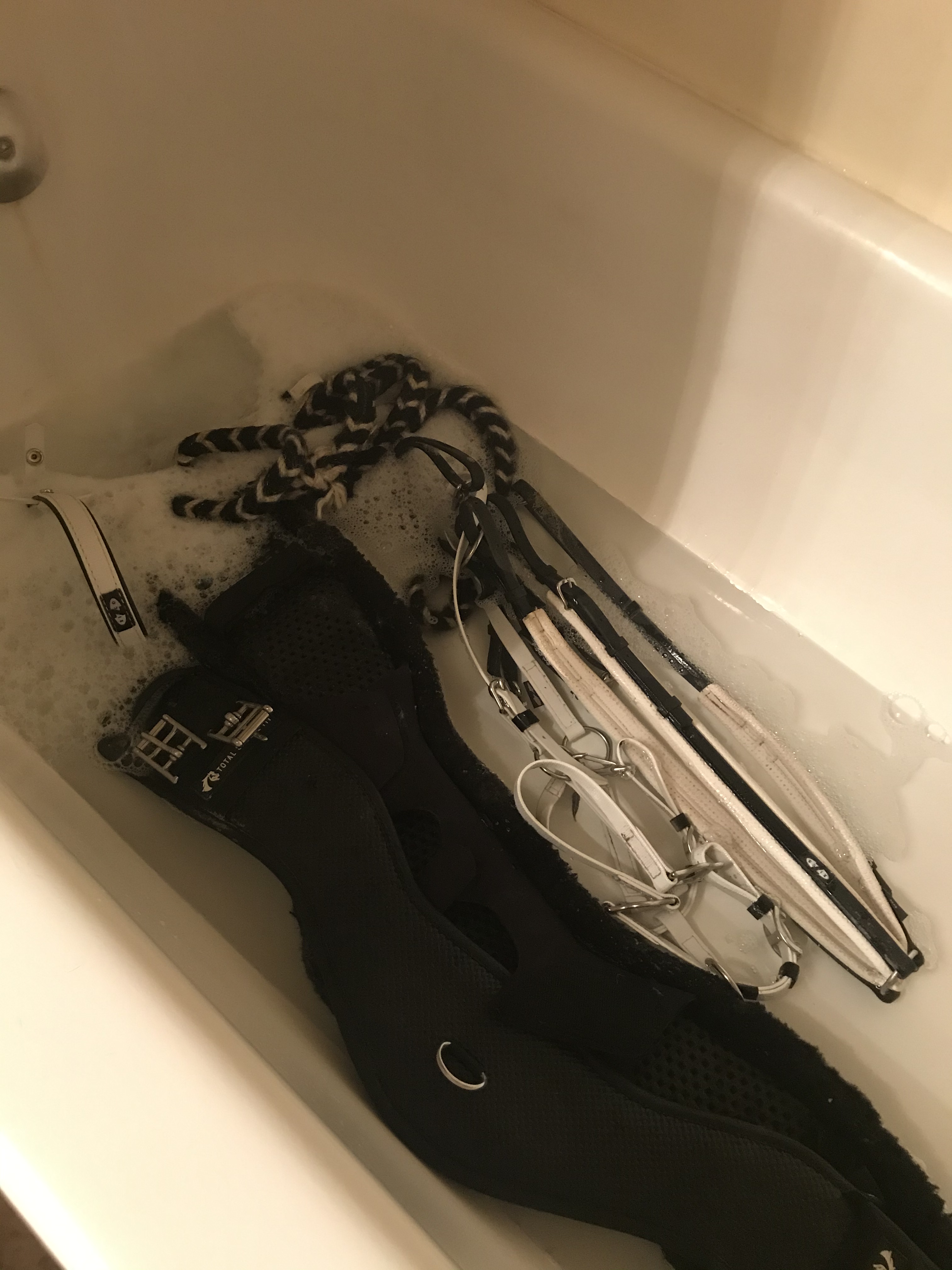 What can I say? At this point, it’s become kind of tradition/habit to wash my tack in the bathtub.