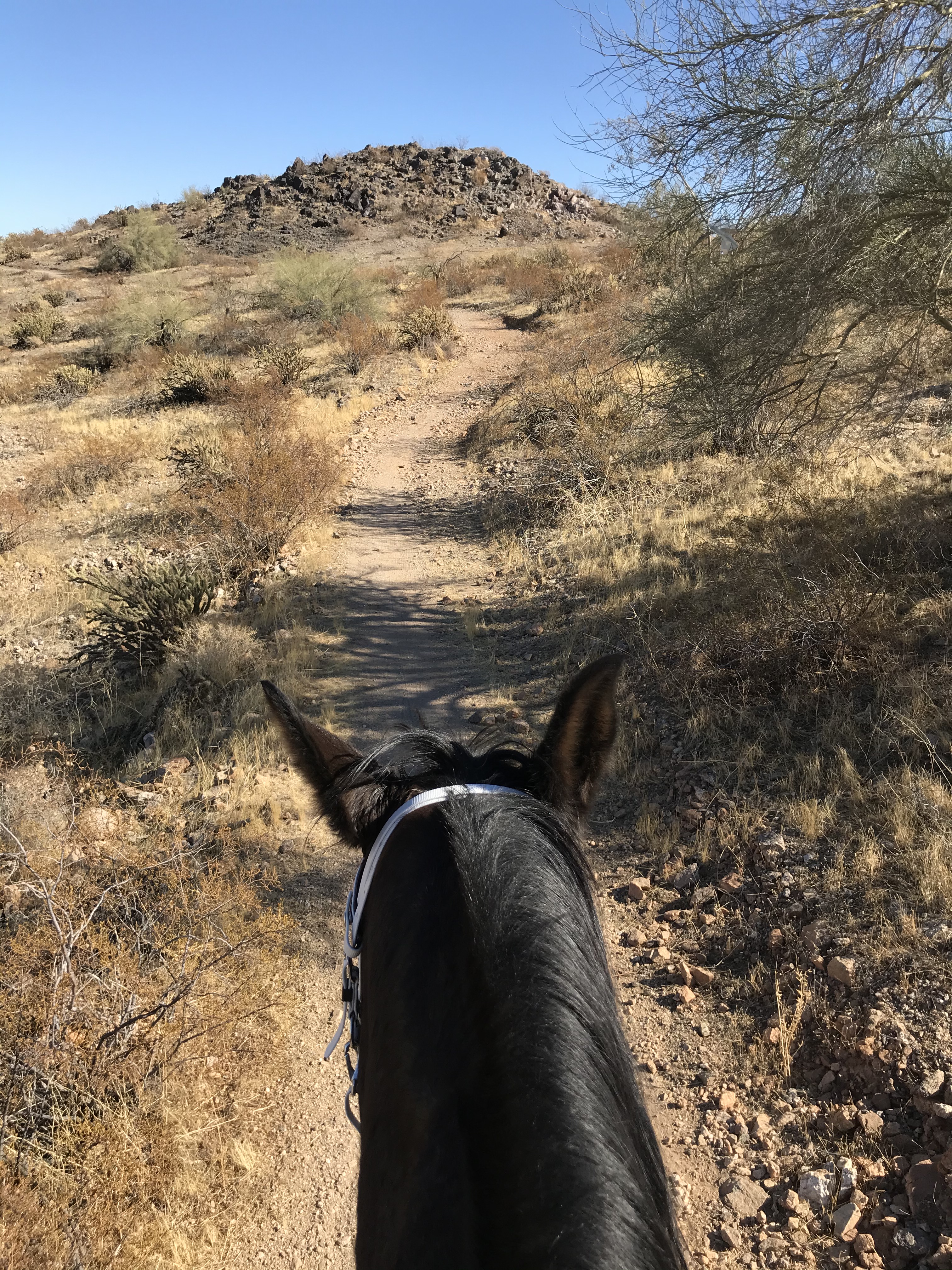 Now seemed as good of a time as any to see what I had to work with, given that she was mentally engaged and very relaxed and settled. I settled myself in the saddle, shoved away the mental uncertainties that always try to pop up whenever I go to pick up the speed, kissed and cued, and after a couple of faster trot strides, she rolled right over into a beautiful canter. She is, hands down, the easiest horse I have ever cantered. She is smooth, and although she’s strong, she collects up beautifully, where I can actually sit down in the saddle, ride with contact, put leg on her, and drive her forward and up into the bridle. Most horses, I have a hard time riding a relaxed canter. They’re either rough enough that it’s not very comfortable, or fast enough that it’s just easier to two-point. Gets you somewhere quickly, but not particularly relaxing, and I always feel way more vulnerable at a canter to either shenanigans or not being able to stay with a sudden shy at speed. In this case, the fact I was able to sit and keep such a strong leg on her meant I felt super secure and stable, even moreso than when she moves into a faster trot. She is also the kind of horse who locks onto the trail and gets even more focused the faster you go, so things that she had been peeking at when we were trotting along (barrel cactus, dead ocotillo, large rocks) didn’t even warrant a side glance at the canter.