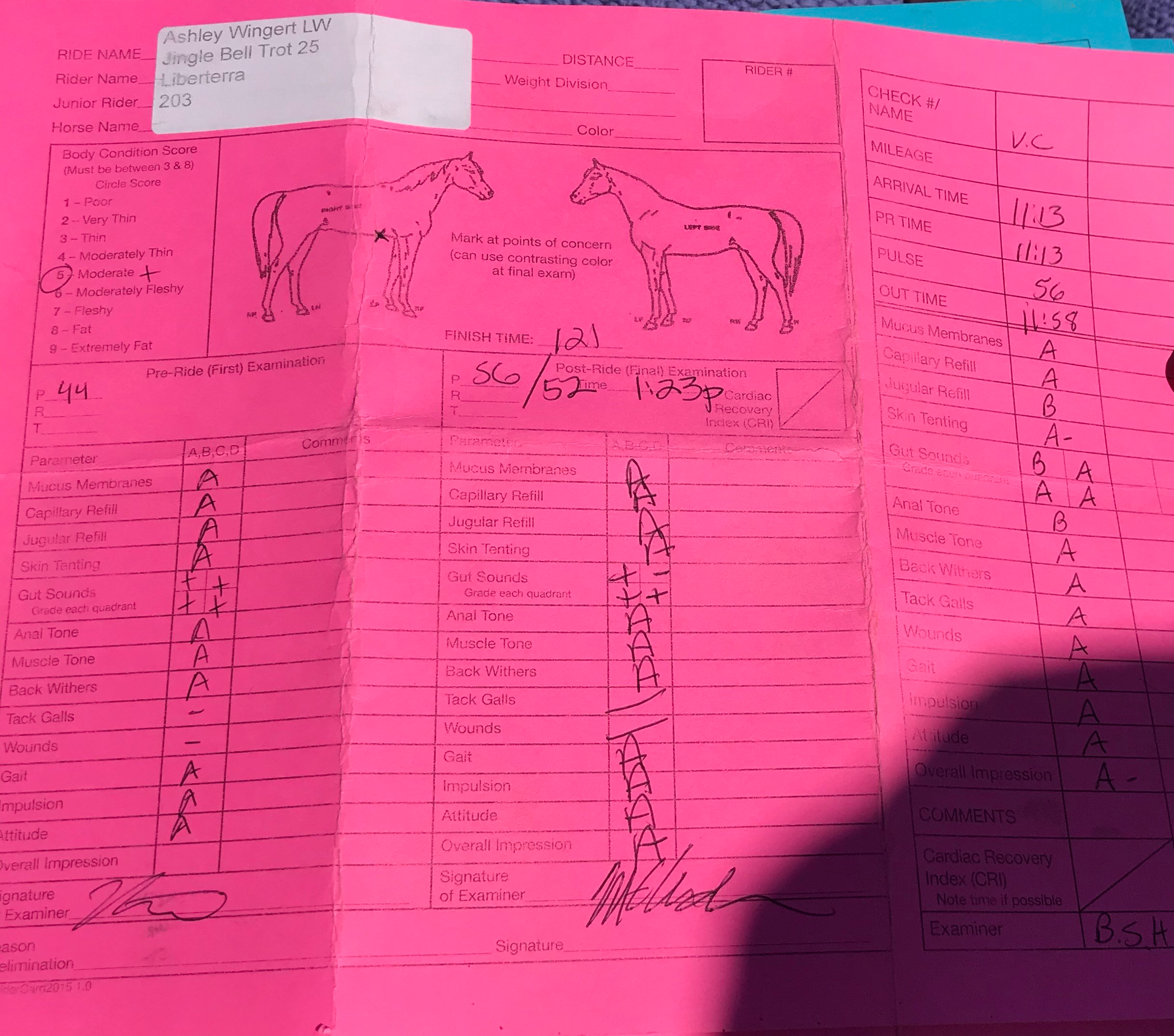Her pulse was still a little high for finish parameters, and it took her a few minutes to come down. I got her another drink, but I didn’t really think about pulling tack or sponging, which probably would have helped. We ended up giving up a couple placings at the finish due to her taking a few minutes to come down (but once she did, she dropped like a rock), so I’ll probably need to work on some more aggressive cooling strategies, given that she’s a dark-coated, larger-bodied horse. Anyway, live and learn, but I think we came in somewhere around middle-ish of the pack, and a very respectable 4:36 finish time. We vetted for completion as soon as she was pulsed down, and she finished with all A’s on her card. Even sweeter was two of the vets who were vetting us this weekend knew us from the past and have had the misfortune of pulling us, or seeing our inglorious overtime finishes, so I got some really good kudos from them this weekend on how good Liberty looked, and of course, the best affirmation of all of good vet scores and passing the vet checks with flying colors and an official finish.