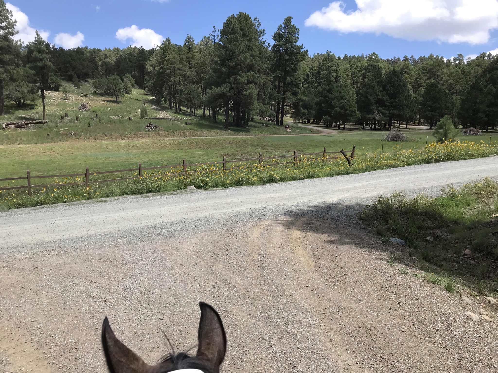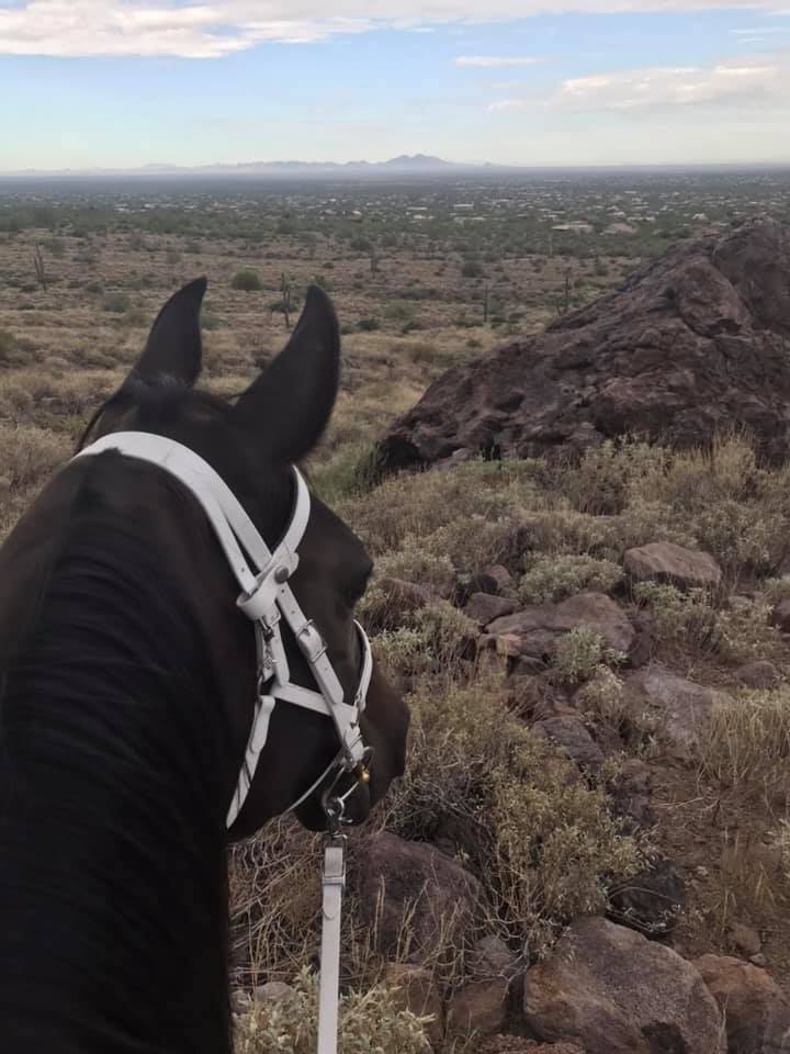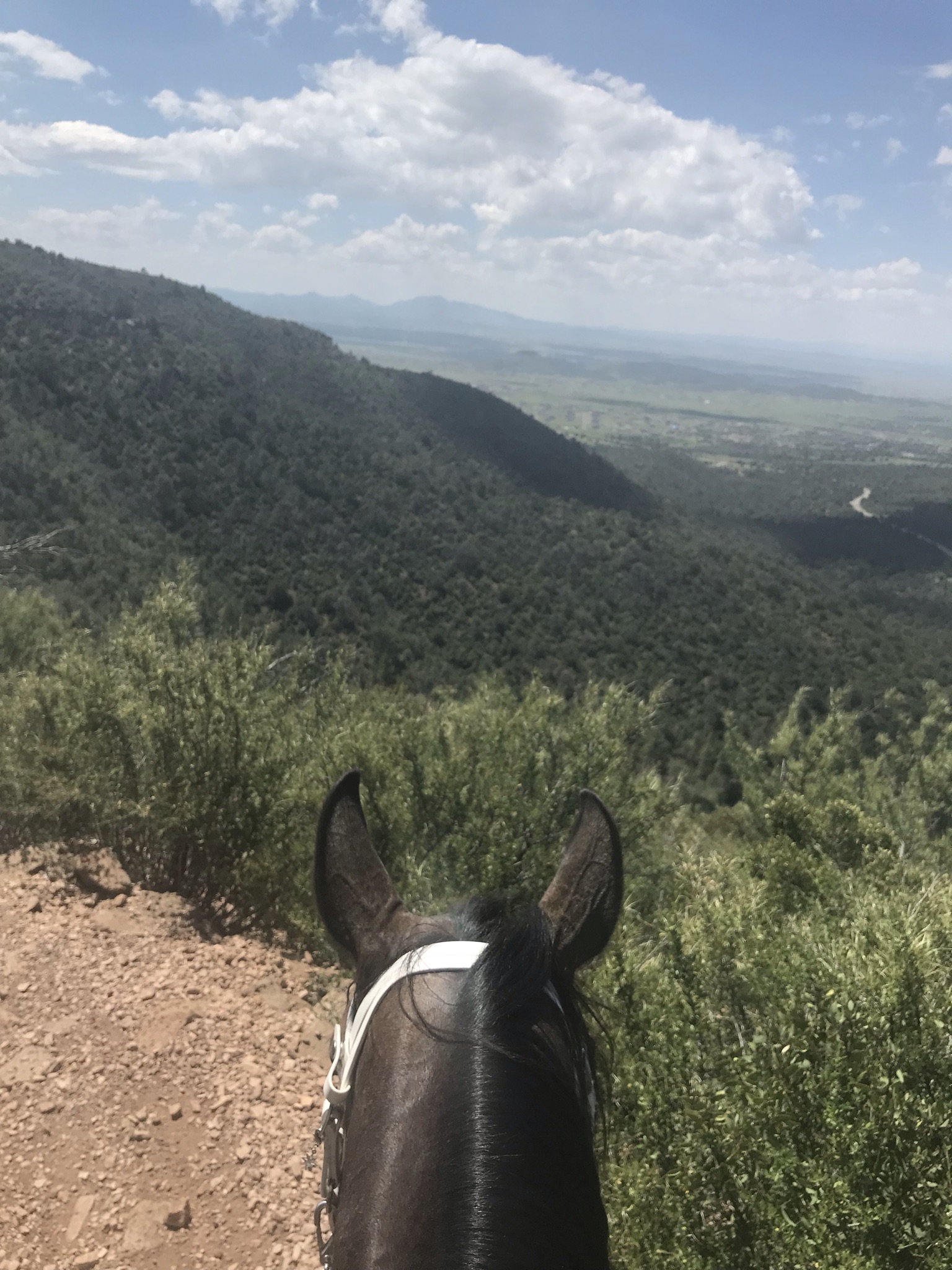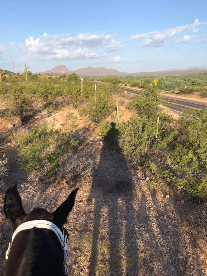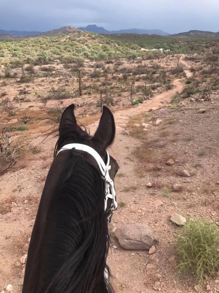 Per the calendar, today the supposed to be the last day of the monsoon season…but I grew up with the monsoon as being defined by starting whenever the weather went over a certain dew point for several days, and ending…whenever it felt like it, rather than arbitrary calendar days. And with a ride this morning of starting humidity of 60% (but temps are cooling off!), and a whole bank of lightning clouds off on the horizon first thing, I will be ignoring the weather people that think they know everything. Liberty is also starting to get a bit velvety-feeling on her coat, a precursor to the winter hair starting to come in. After a long summer, we are all beyond ready for cooler temperatures.