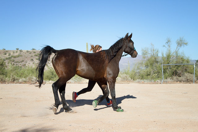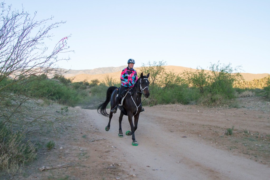 Down in the wash, it felt really good to stretch out and move. Somewhere along that section, either in the last bit of rocks or in the sand, Libby popped a hind boot off — she had shredded the pastern strap a few miles back on the road, but I had hand-waved it away, figuring I would replace it when we hit the water stop, since she’s held her boots without the pastern strap numerous times before, but when we got to the water stop I glanced down and realized she had managed to slip that back boot off. <sigh> (Fortunately, someone found it and turned it in to lost-n-found, so it wasn’t lost to the sands of time forever…)