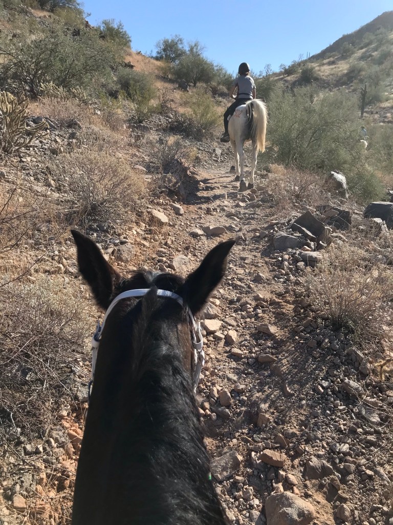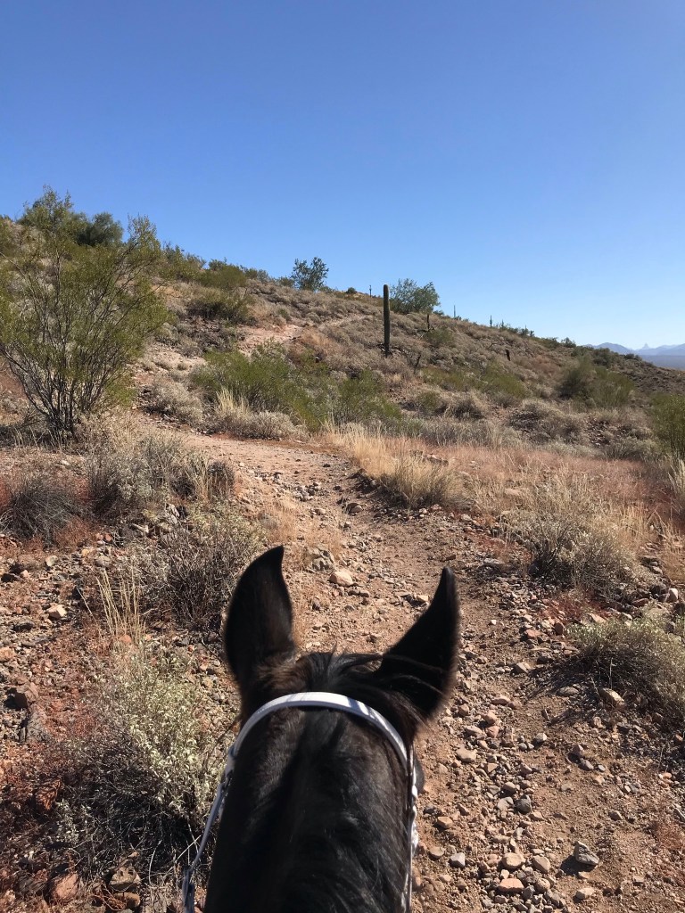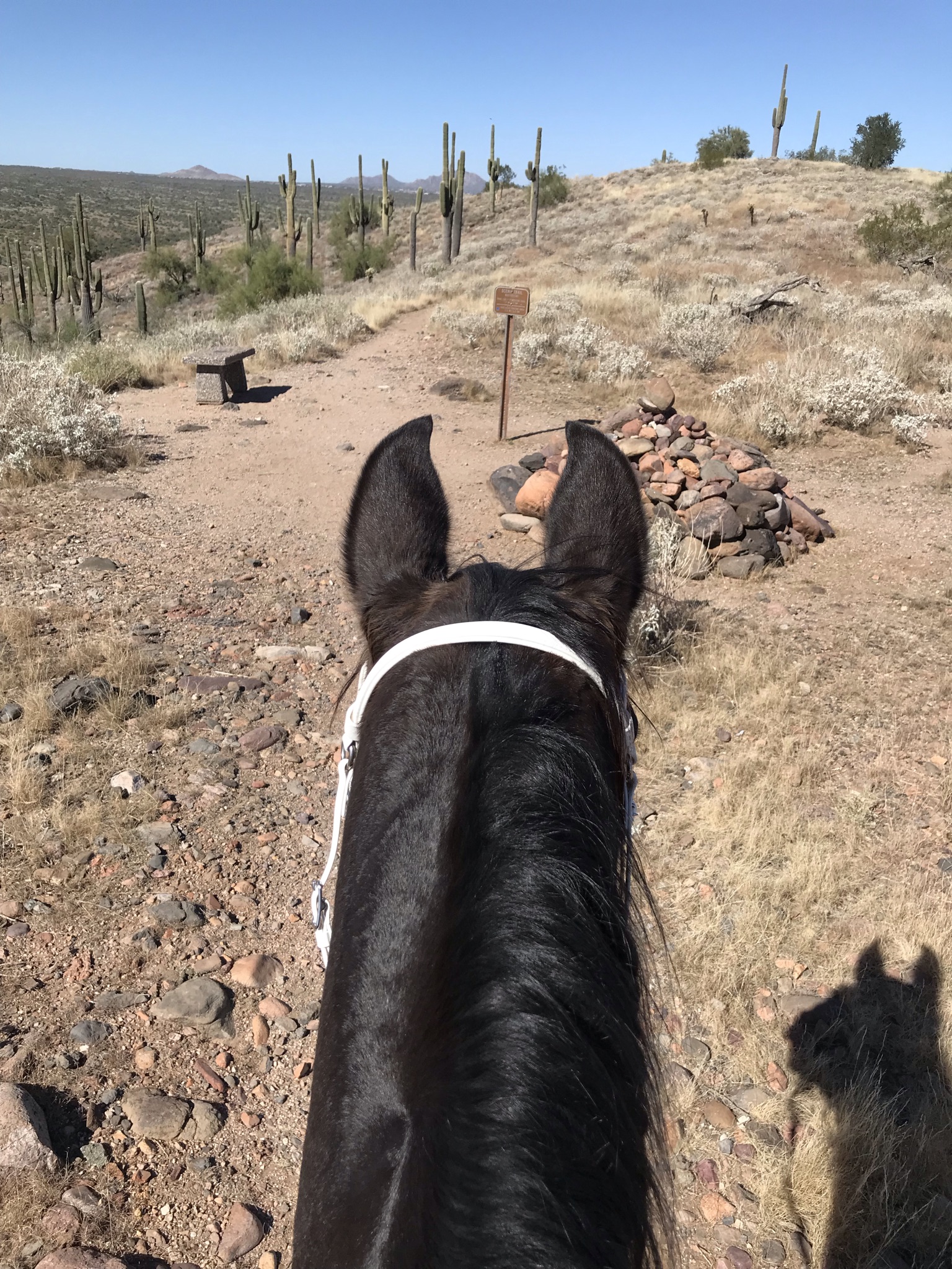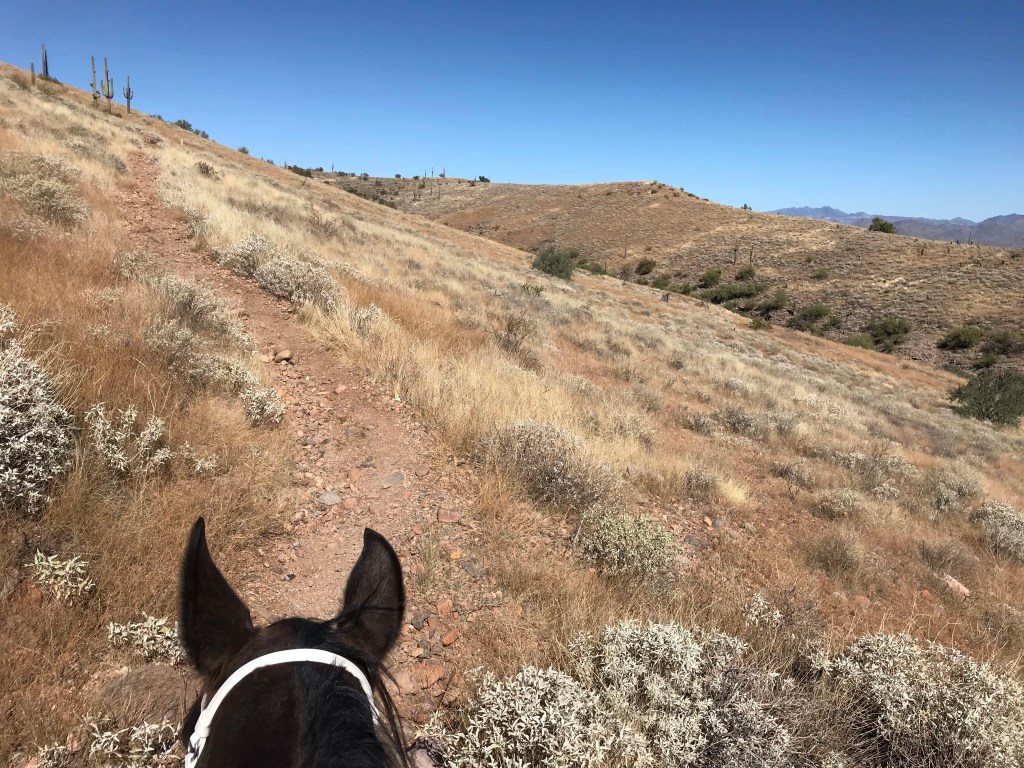 Usery is a pretty part of the trail, and marks what I consider the start of “the easier part of the ride.” Aside from a couple miles of some climbing up to a ridgeline on loop two, most of the ride is now fairly flat, has good footing, and is really fun to cruise through. Except when your horse is too busy staring at people on a bench to notice the embedded rock in front of her, and catches a toe and takes a knee…<sigh> Fortunately we stayed upright, and she only scuffed up one knee a little bit. Still, not awesome, and I spent the next several miles crossly reminding her to “watch her feet” every time we’d come upon some rocks.