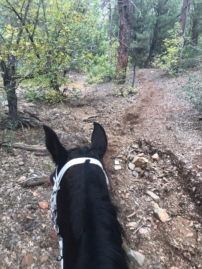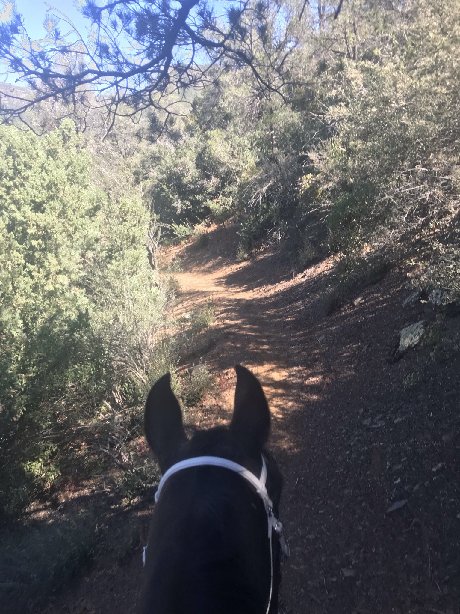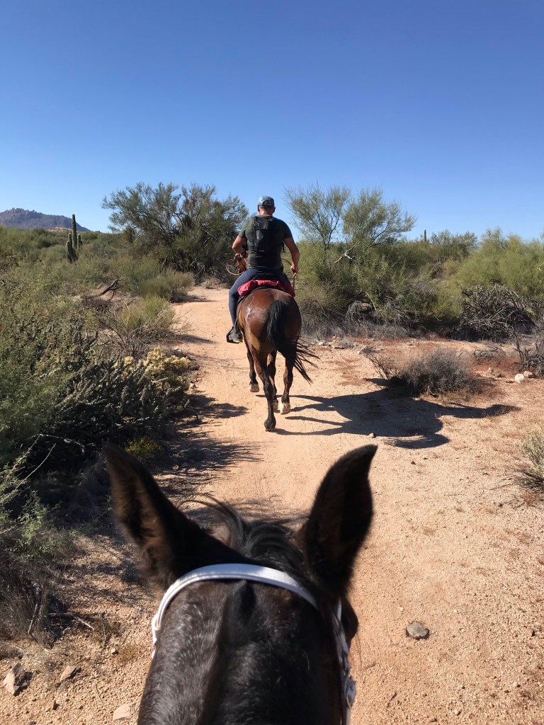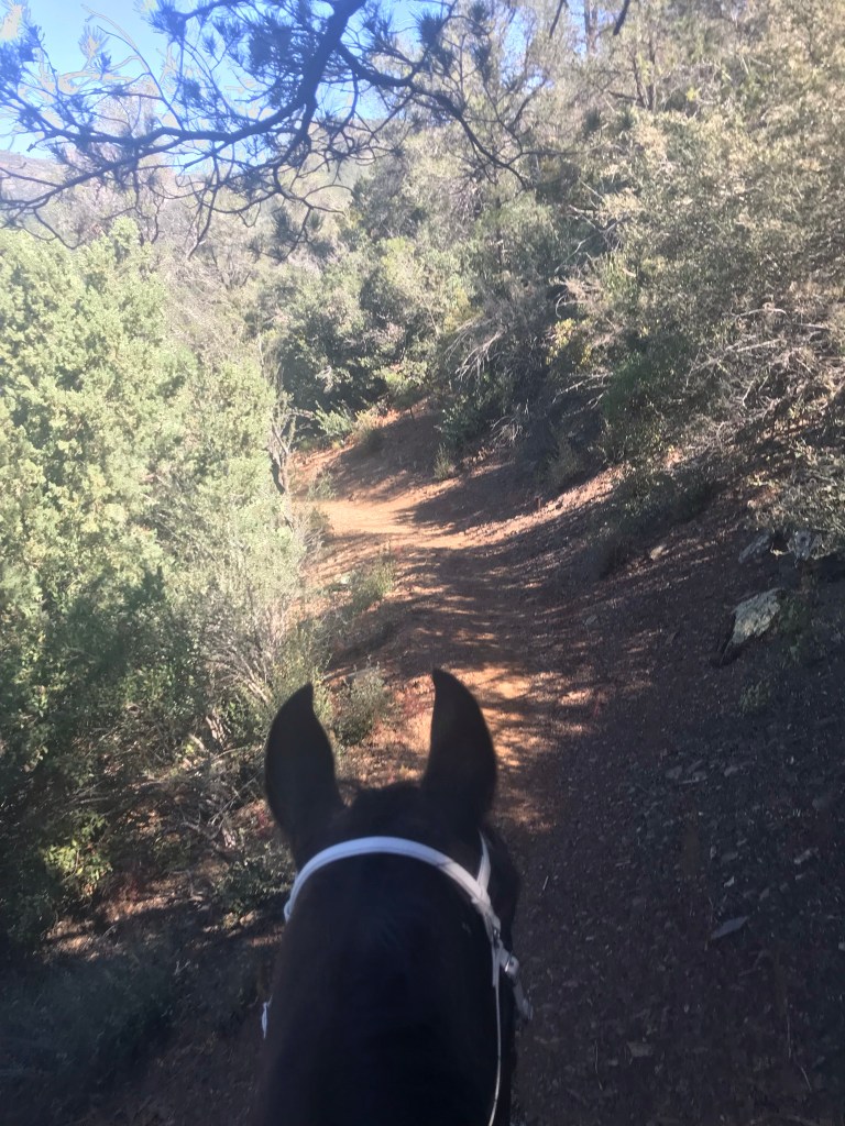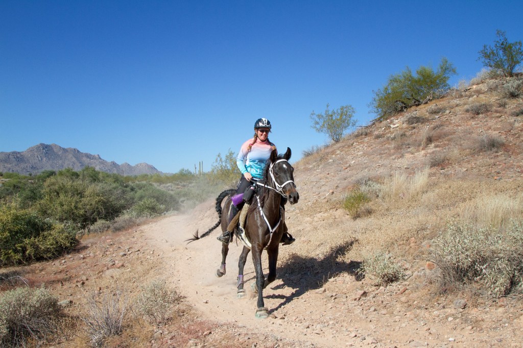 Usery is a pretty part of the trail, and marks what I consider the start of “the easier part of the ride.” Aside from a couple miles of some climbing up to a ridgeline on loop two, most of the ride is now fairly flat, has good footing, and is really fun to cruise through. Except when your horse is too busy staring at people on a bench to notice the embedded rock in front of her, and catches a toe and takes a knee…<sigh> Fortunately we stayed upright, and she only scuffed up one knee a little bit. Still, not awesome, and I spent the next several miles crossly reminding her to “watch her feet” every time we’d come upon some rocks.