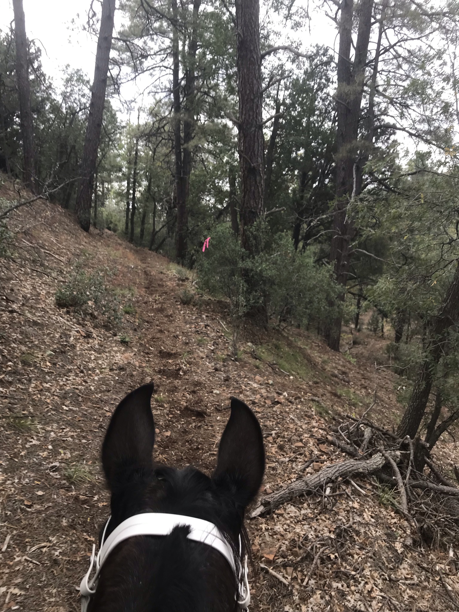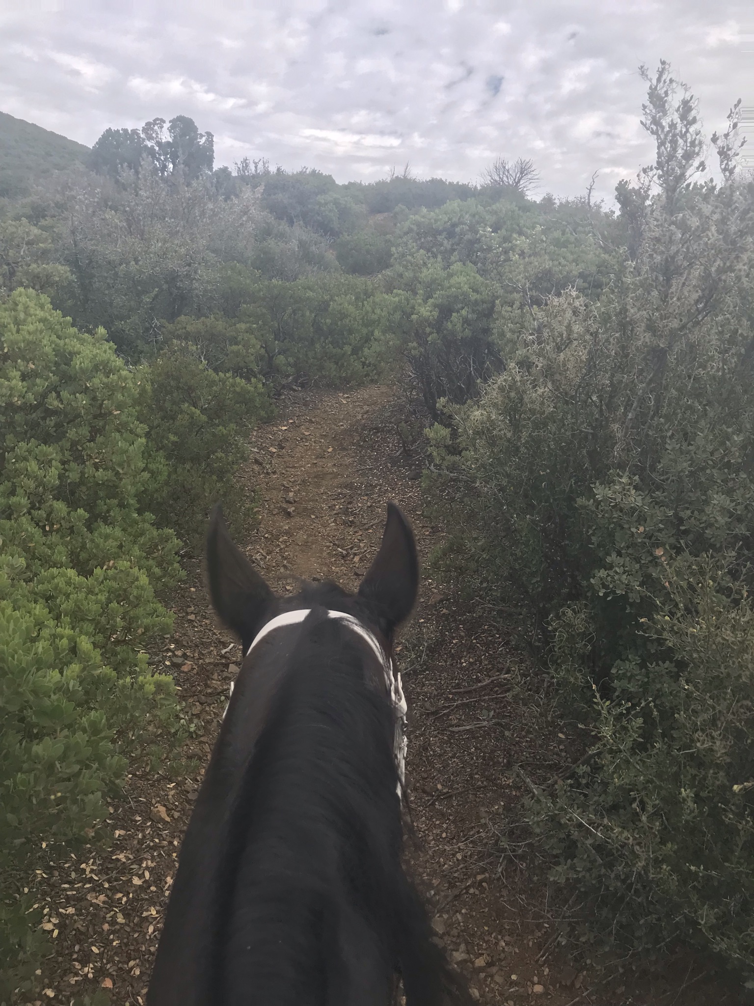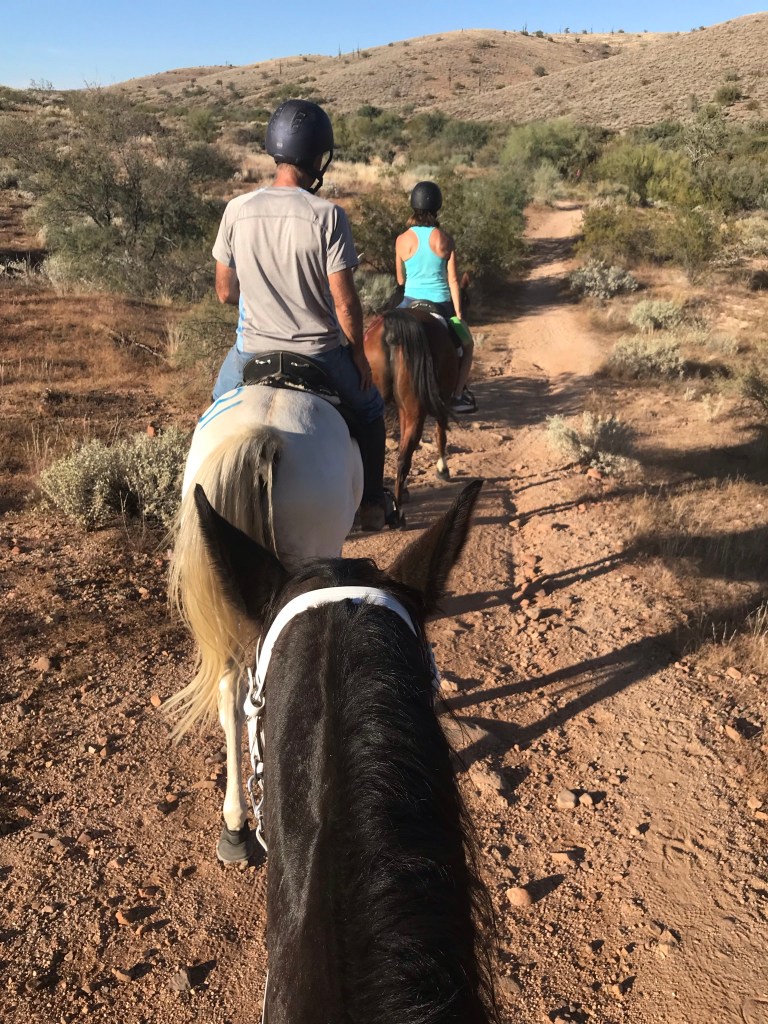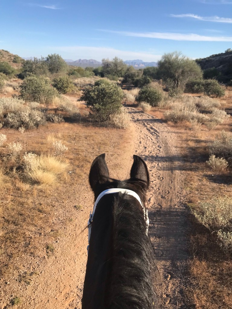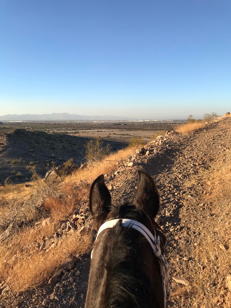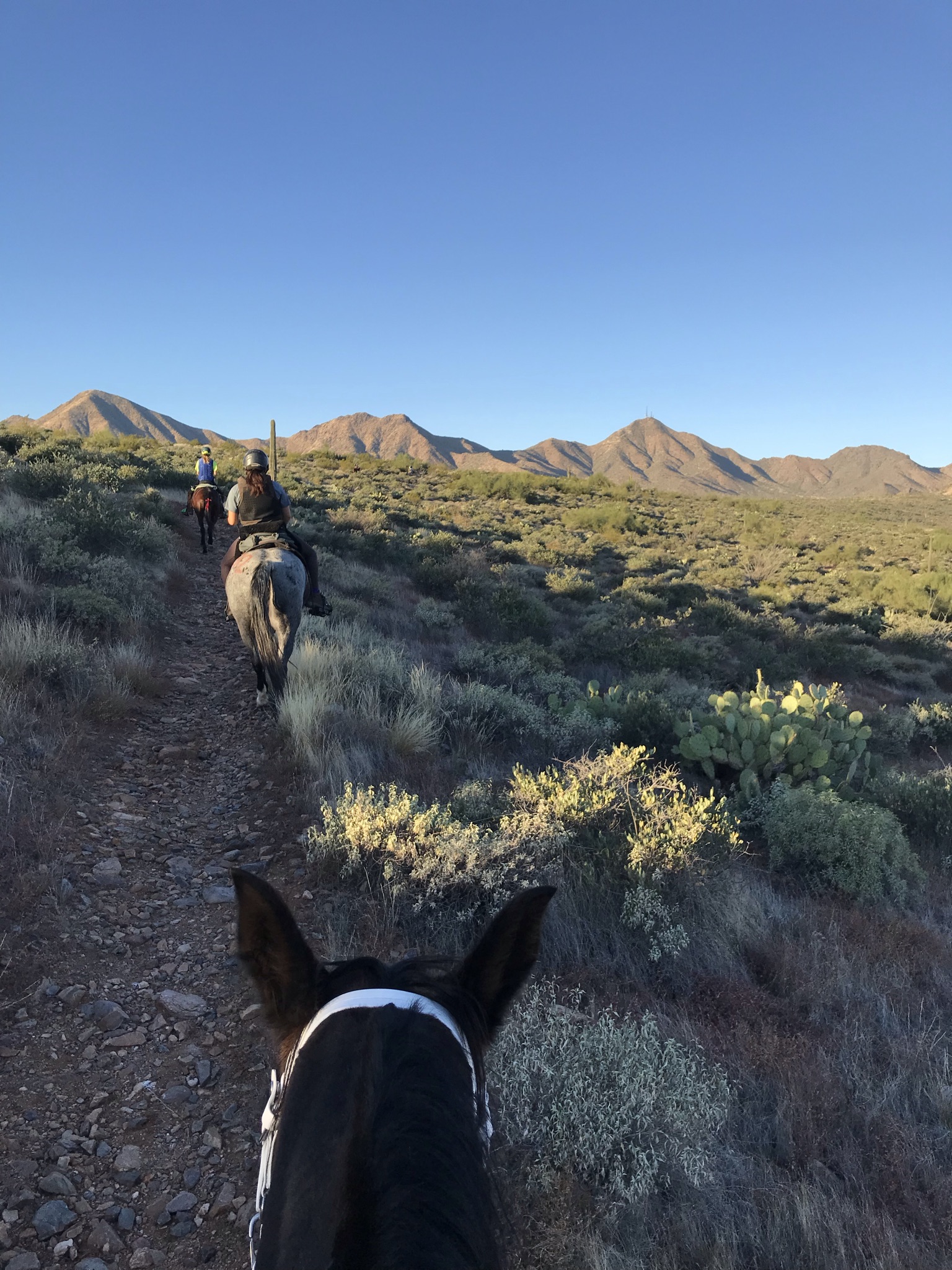 The sun was just starting to come up as we hit the trail, and with it, came even more wind. Fortunately, neither mare was at all fazed by it, and we were able to set a very comfortable pace, making good use of some of the nicer parts of the trail early on. Up on the ridgelines as we made our way into the Goldfield Mountains, the wind was gusting at over 45mph…that was the first time I had truly experienced wind that actually threatened to blow me out of the saddle, and it was wild. Super proud of both mares for forging on through and not even batting at eye at the gusts.