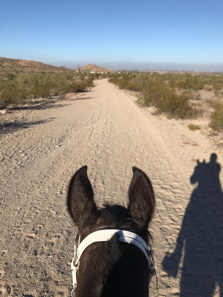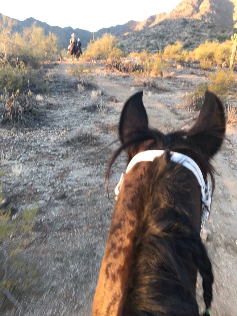 Loop 2 is one of my regular training rides out here, so both horses were on autopilot, in a good way. They knew the trail, and were quite relaxed and happy about it. Partway through the loop, I ended up putting Liberty up front. Hailey and Jantar had led a good part of the ride thus far, with the exception of several miles through Usery Park, and had done an amazing job. Jantar actually prefers the front most of the time, but getting her more comfortable with not leading all the time has been part of her training agenda more recently, so I figured this would be a good time to see how she did. Fortuantely, she and Liberty have really hit it off, and she ended up being quite okay with us going in the front for the next few miles, and then trading off again…we rode the whole rest of the ride that way, trading off leading every few miles.