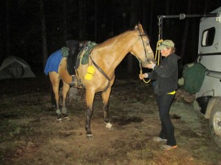 Kaity prepared coffee, I got Fergus a mash, then we stood around, sipping coffee and slipping Lucy bites of breakfast until it was time to saddle up Fergus. While Kaity took down camp, I walked with Lucy to her Pen 2 start.