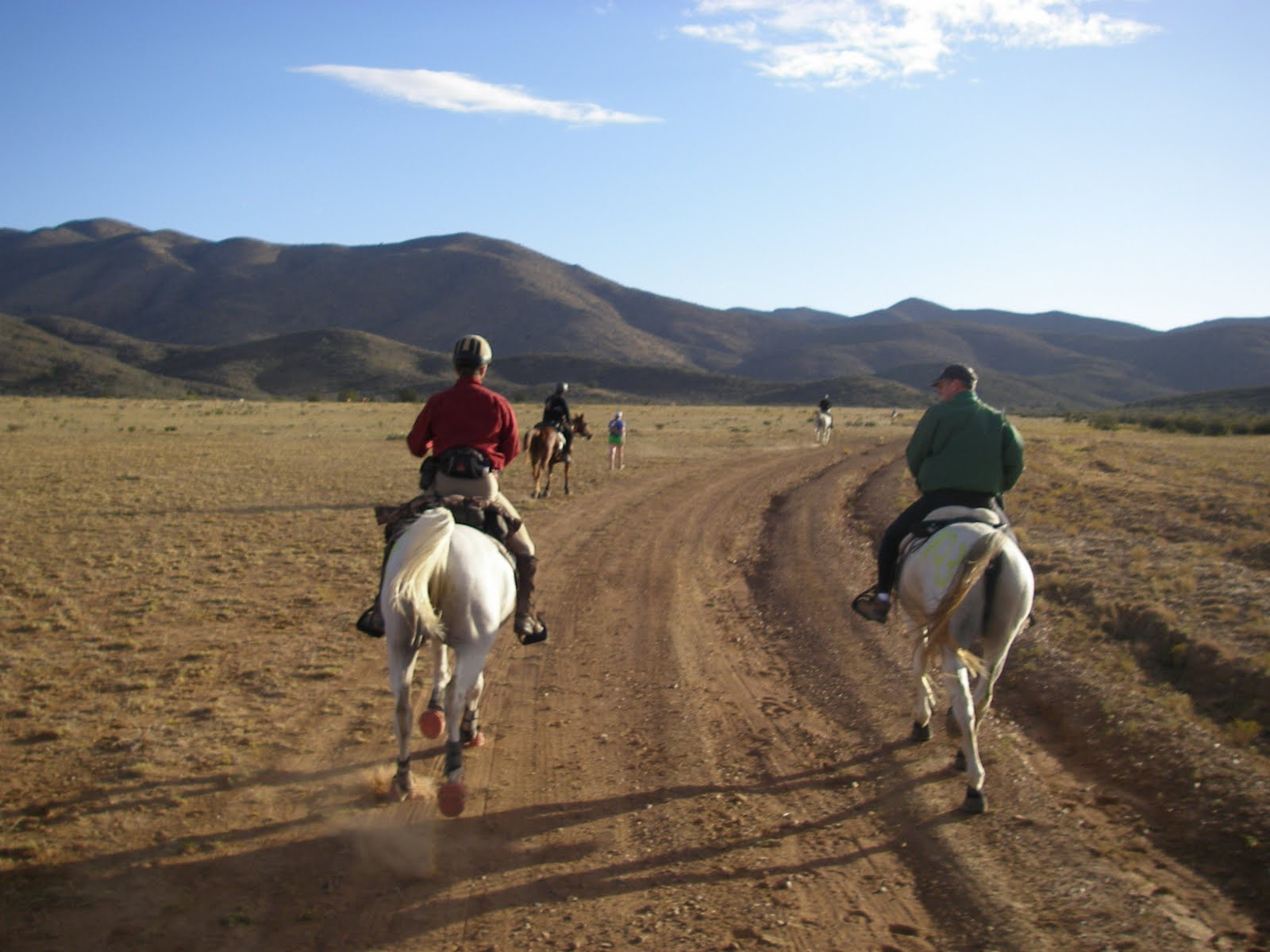 So we waited until a couple minutes after the start, hand-walked over to the start, mounted up, and headed straight out. Since the pack was pretty much out of sight, we were able to pick up a polite trot right away, and that was that. Beeba was settled within the first couple of miles, and she was perfectly happy to trot along behind Barb’s horse K-Man.