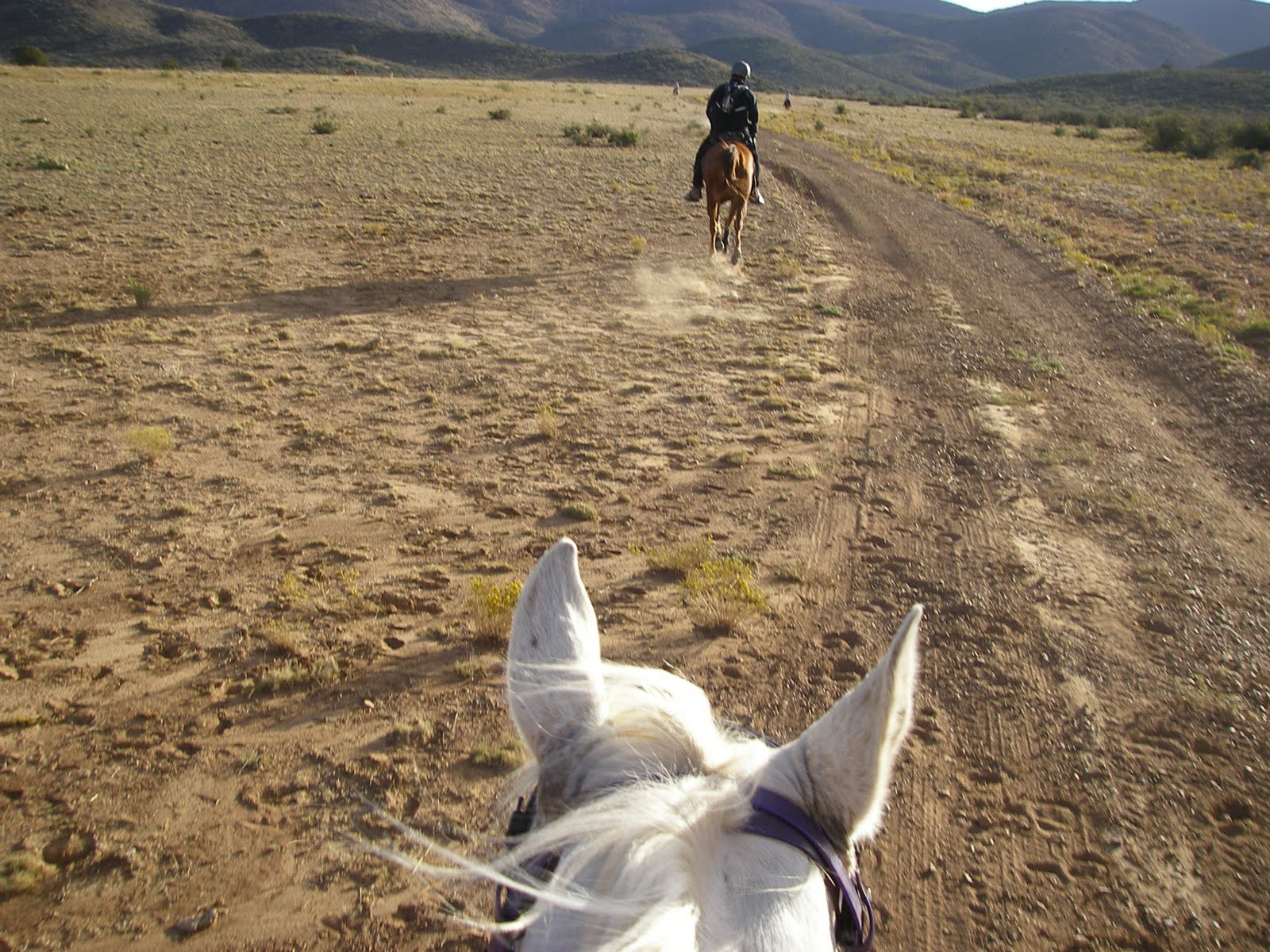 Ride start nerves were out in full force again Saturday morning, albeit not as bad as at Virginia City. Barb and I waited back at the trailer until the pack cleared out (To recap: it’s an uncontrolled, “shotgun” start [at least they don’t actually fire a gun anymore] that drops through a rocky wash, then opens up through an open field. And you sort of just roughly follow along what used to be an old two-track road but has gotten fairly overgrown. Not a conducive environment for two horses who are not known for having the best start line behavior.