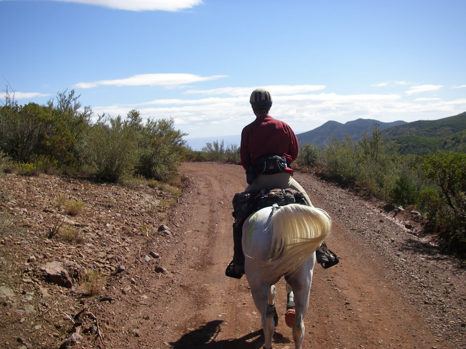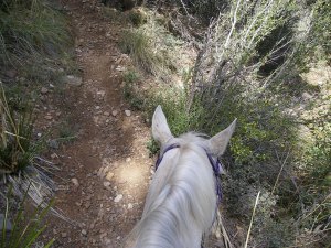 About 9 miles in, the trail hits one of my favorite sections: “the grapevine.” It’s roughly 7 miles up to the first vet check, and most of it is winding up through a canyon, twisting and turning in and out along a dry streambed, and then climbing up through manzanita bushes. So pretty, and so fun, especially on a athletic, agile horse.