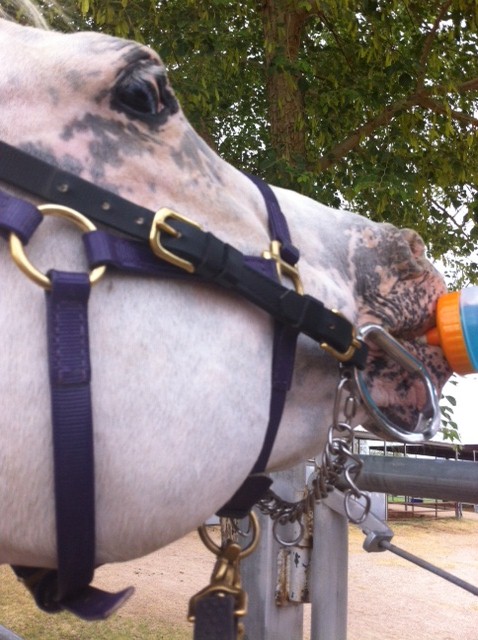 Her Gatorade habit started back in my show days, before I had a clue what electrolytes were all about…all of us kids tended to do the “bite for me, bite for my pony” approach to food, and our ponies usually partook on whatever we were munching. Only Mimi really loved Gatorade, especially the orange flavor. Her preferred method of getting it was licking it right out of Mom’s hand…much better than out of a bucket.
