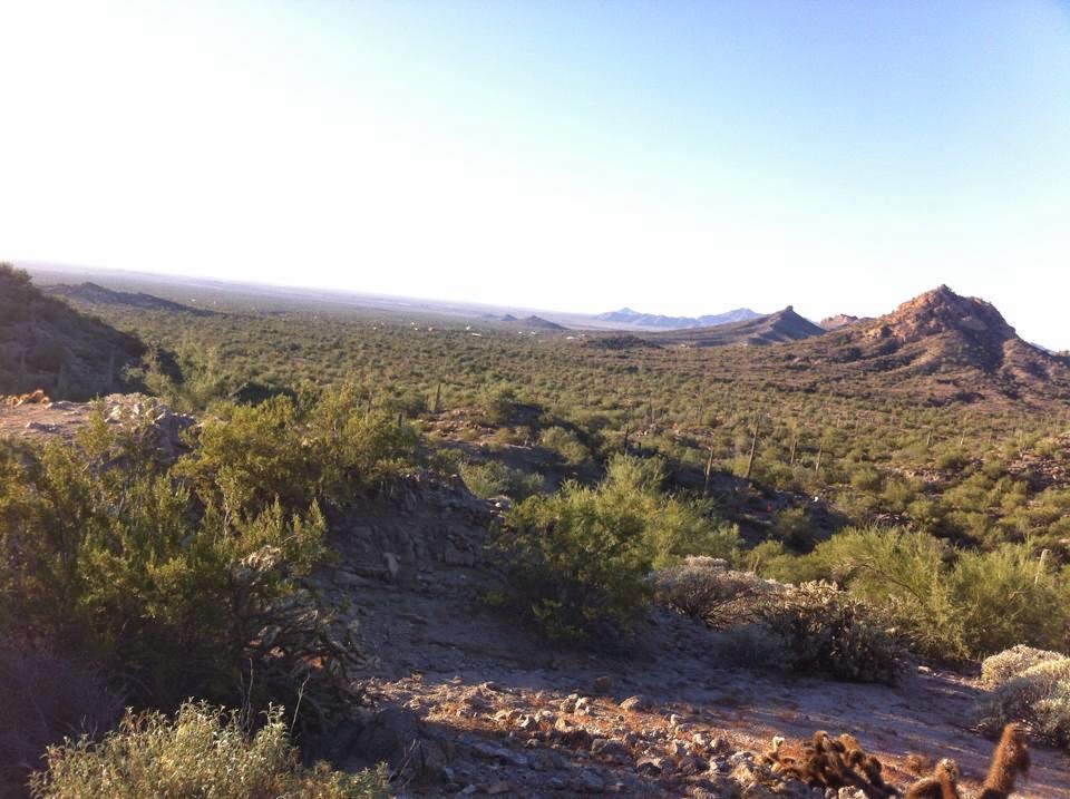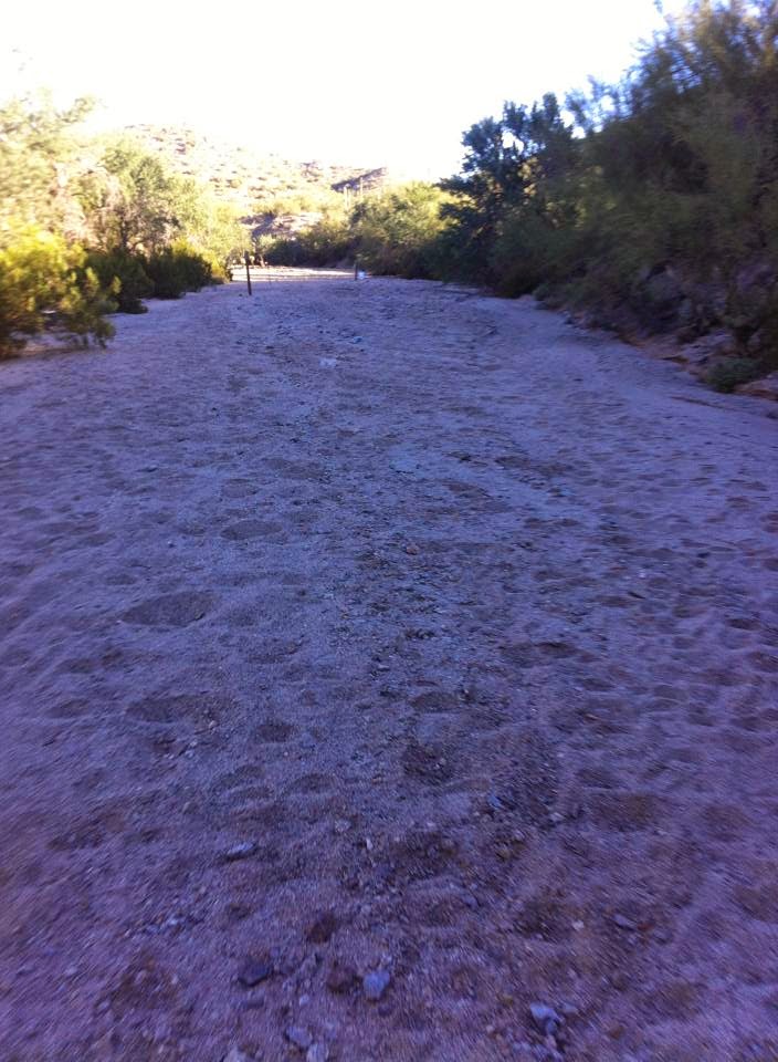 Back to the start…right at 5:00, we were given the countdown and probably ~50 or so runner who had chosen the early start option were off in the darkness, headlamps bobbing and lighting the way out the same road we had just driven in on. The first mile was the pavement road leading out of Lake Pleasant and onto a wide, smooth dirt road that curved around the northwestern edge of the lake and then started heading north.