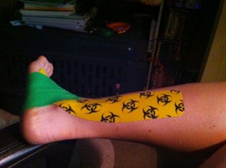 And see all that tape on my left leg? I had tweaked my IT band somehow during the Mesquite Canyon half marathon two weeks prior…the first half of the race was great, and then all of a sudden it hurt to run or even walk downhill (of course the rest of the race was all downhill at that point), and although I had been icing and slathering with arnica and foam rolling, it still wasn’t 100% by race day and I was hoping holding myself together with large amounts of tape would be effective.