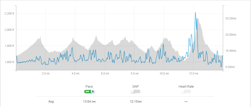Unfortunately, my IT band had started making its presence known by a couple of miles in…it hadn’t gotten much worse, but it was impacting how well I could run downhill.