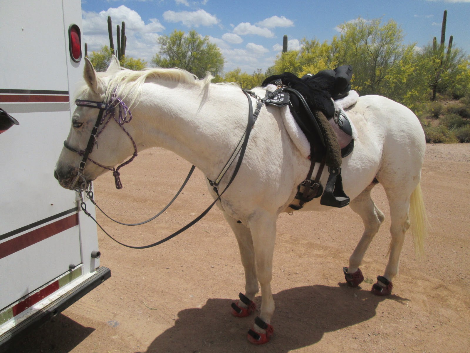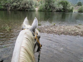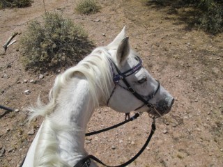 At one point, the trail paralleled the Hassayampa Creek, and we were able to go down at one of the road crossings and let the horses drink. And drink. And drink. One of Liberty’s virtues is no matter how uptight or nervous she is, she reliably eats, drinks, pees, and poops along the trail and under saddle.