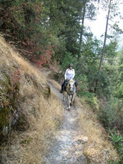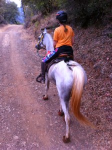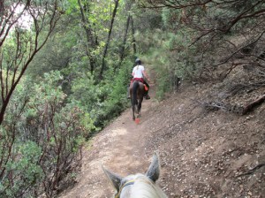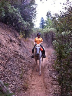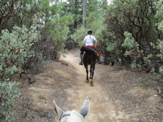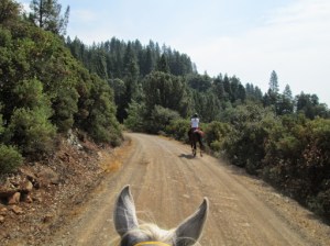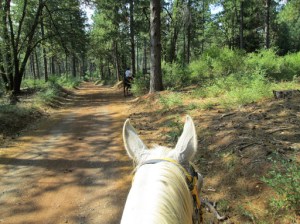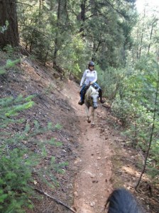 We hand-walked through camp, across to the trailhead, and I mounted up and we set off down the trail. Kaity had also instructed me on making some changes to my riding position…and the changes she had me make are the missing puzzle piece I’ve been searching for on my own for a number of years. I had been mistakenly adopting too much of a chair seat, thinking that was the key to trying to stay centered, but in reality, it was tipping me back too much, not letting me put leg on the horse, and being countered with my tendency to then hunch my upper body.