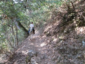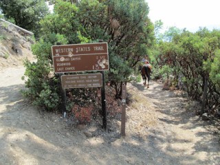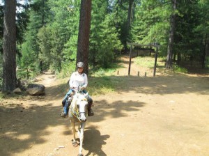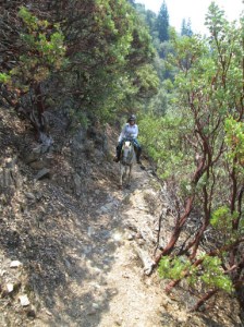 And it was a total non-issue. (With both horses.) I think Liberty was more interested in the Golden Retriever. Go figure…but better safe than sorry. Once we passed, I hopped back on at the next convenient mounting rock, and we scuttled up the trail, pausing every so often to let the ponies grab a bite of nice green mountain grass.