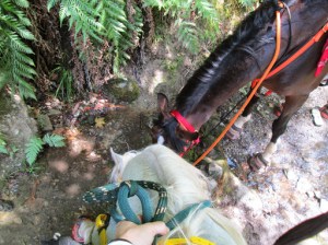 I was so proud of how well Liberty held it together…we were following Ani (like most horses, she feels more vulnerable being the one in the back, and can be sensitive to the idea of things jumping her from behind), there was some very technical trail obstacles, we were going downhill on a pretty good grade, and to top it off, the saddle was threatening to slide up on her ears and I’m sure it wasn’t particularly comfortable. (She will definitely be a crupper horse.)