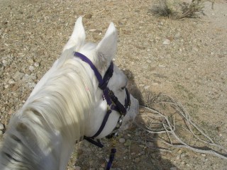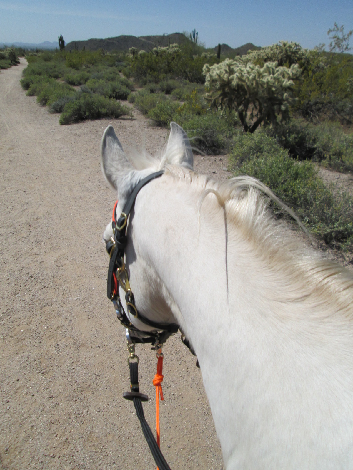 Whatever the case may be…I had BRAKES on the trail again today. All it took was a couple of light finger taps on one side or the other when she’d start rushing, and she’d back off. The real test will be speed work, but we kept it pretty much to a walk today. (Except for a few times she snuck in a bit of a trot.) But we did a ton of up and down hills and gullies, and she did really well. No head tossing, no fussing, and minimal pulling weird faces when we’d stop.
