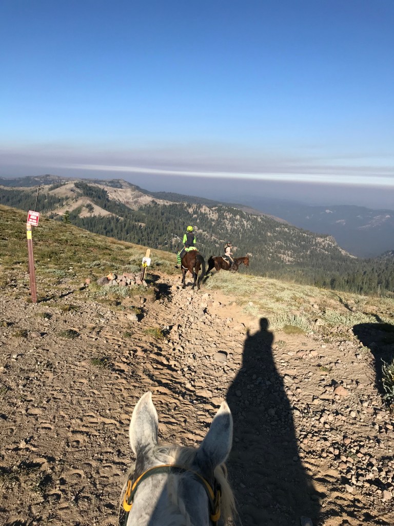 It is Tevis tradition to look back over your shoulder as you crest the top of the mountain at Watson’s Monument and take in the view of Lake Tahoe. Unfortunately, on my year, the smoke from forest fires was so bad, I couldn’t actually see the lake but for a tiny glimmer in one spot. Oh, well. Guess that means I have to go back and get the “proper” view. :D