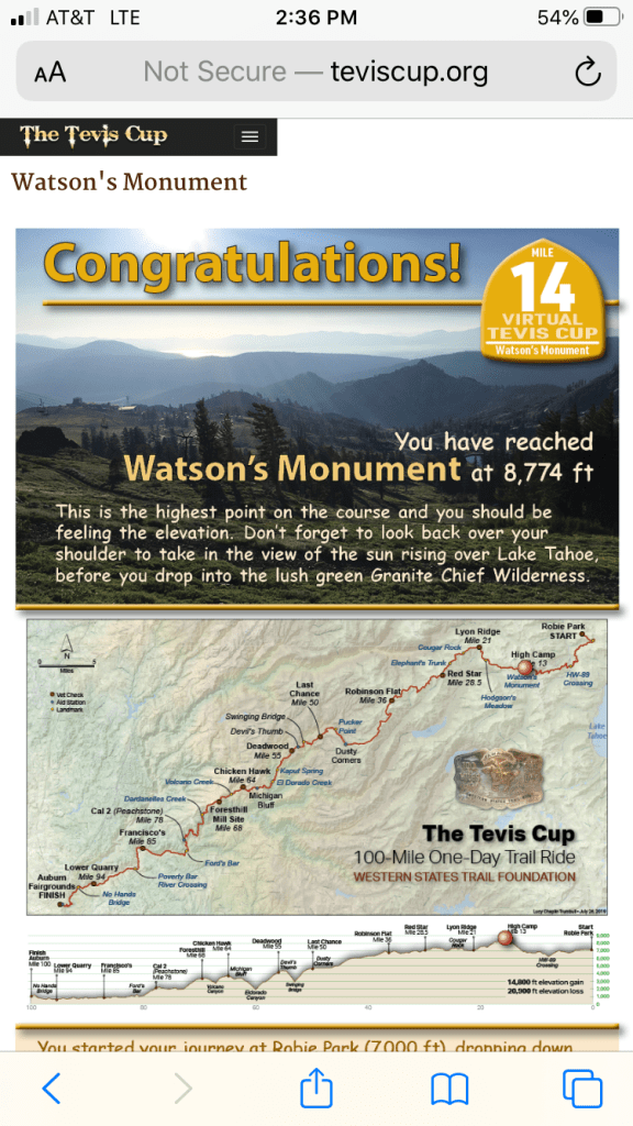 With today’s ride, we reached our first Virtual Tevis milestone — 14 miles to High Camp and Watson’s Monument.
