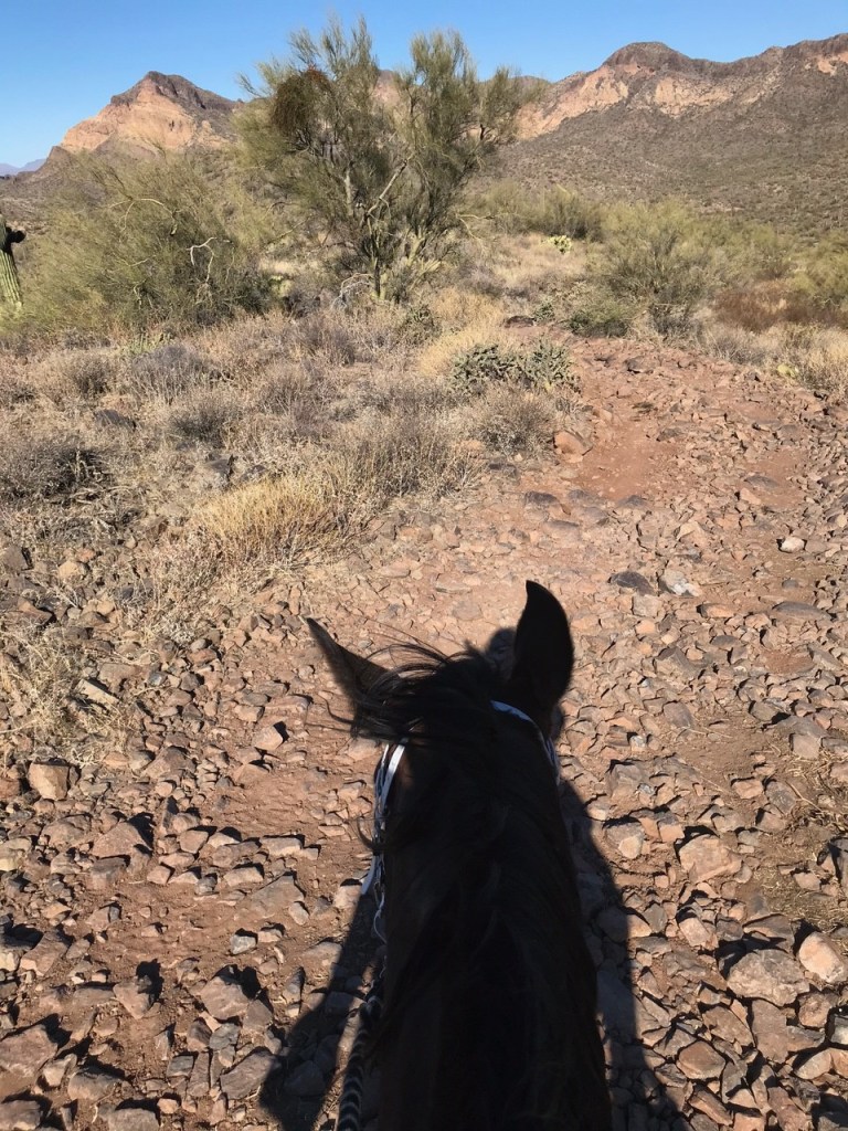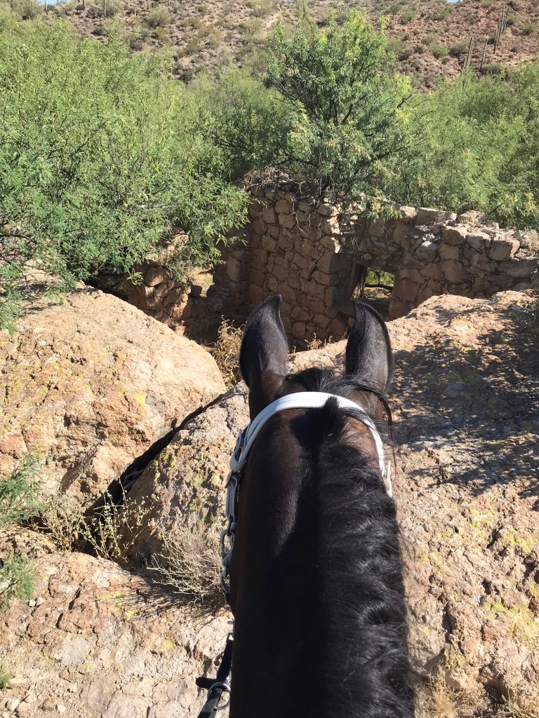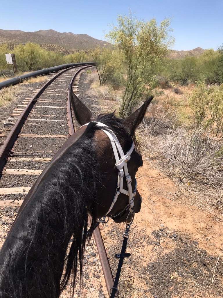 Also known as “Hewitt Station,” is a portion of the Arizona Trail that runs through the Superstition Mountains; this particular section is north of Picketpost Mountain. It’s a trail ride versus an endurance conditioning ride, but I do love my ponies to be versatile and adaptable, and to be able to rock-n-roll through a fast endurance pace one day, and then mosey through technical trail the next. There’s the remnants of some old stone houses tucked away if you know where to look for them, we were fortunate enough to find one of the seasonal creeks still flowing a bit, and Liberty met train tracks for the first time (the now-defunct Arizona-Magma line that ran cattle and copper down to one of the main rail lines in the Valley).