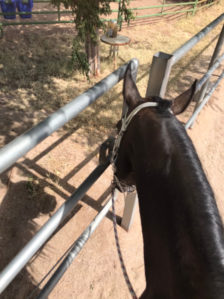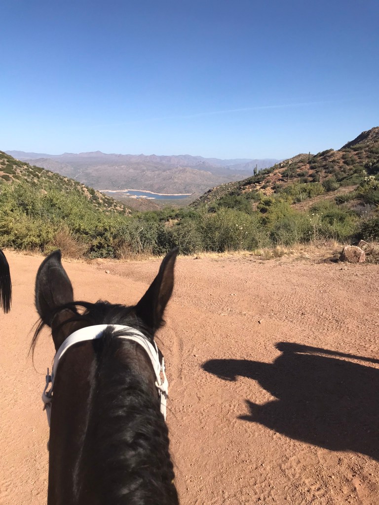 Off in la-la-land to have dental done. After a session of natural balance equine dentistry, I saw some marked improvement in her acceptance of the bit and softness, so she definitely needed some work done. This was my first experience with this approach and so far, I’m liking it.Someone got a new stable halter…and she doesn’t know what to think about it. October is Mimi’s “Gotcha Day” month and this year marked 24 years together for us! <3 A good chunk of this month was devoted to working on trailer loading. She did good work last weekend, so <fingers crossed> that we’re on the leeward side of that climb.New PerformaRide tights and matching buff.October is also Sofie’s “Gotcha” month…5 years for my sweet heart-dog.I set up my GoPro for one of my arena sessions. It…wasn’t pretty. At least screen caps I can selectively pause at “reasonably together” moments. It’s been a long time since I’ve looked at video of myself ride, and let’s just say I’ve got some work to do.This mare’s brain impresses me so much. That road in the background dips down at that point and then climbs again, coming within about 60′ away from where we park at this “trailhead” (really more of a large pullout off the road). We were passed by 18-wheelers, groups of motorcycles, trucks pulling boats, vehicles with kayaks and rafts strapped on top, and none of it fazed her. And at this point, we were the only ones there, too.I love riding Bulldog Canyon. Aside from doing the Tonto Twist ride in January, it’s been a while since I’ve done any training rides out here and I forget how nice of a trail it is and how gorgeous the scenery it is. This is one of the larger wash sections but it’s a mix of sand wash and double-track road and single-track trails.She’s another horse that I tend to have a stupid grin on my face whenever I ride, especially out on trail. We’re a bit of a hot mess express in the arena, but on trail is where she truly shines, and I spent most of the ride either giggling, or with an ear-splitting grin on my face. And a lot of exclaiming, “I love this horse.”Salt River is running really low right now, but it’s still pretty, and made for very peaceful and easy drinking towards the end of our ride.